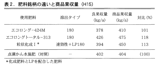 リニア型の溶出特性を有した180タイプの肥効調節型肥料について,数種類の銘柄を検討したところ,エコロングトータルを用いた区で収量が高かった(表2)。