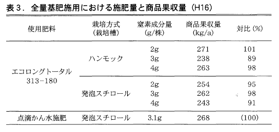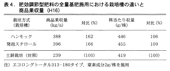 肥効調節型肥料による全量基肥施用とした場合,ハンモック式と発泡スチロール式栽培層とも収量は同等となり,栽培層の違いによる影響は認められなかった(表4)。