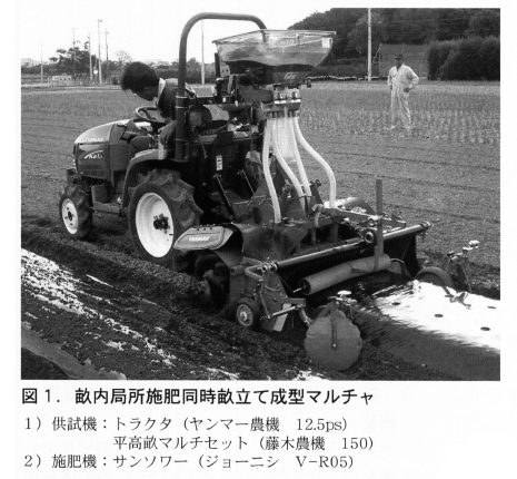 小型トラクタ(12.5ps)に畝立て成型マルチャを装着し,トラクタの安全フレームに施肥機を固定して,肥料の散布位置を調節することにより,畝立てしながら畝内の目的とする局所に施肥し,同時にマルチ被覆も行えるようにした(図1)。