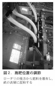 本装置を用いて,畝立て成型マルチャのロータリの後方から肥料を散布し,畝の表層5cmに混和するよう考案した(図2,3)。