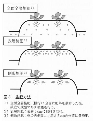 慣行の全面全層施肥では,土壌全面に肥料を散布しロータリで全層に撹拌するため,表層施肥に比べて肥料の分布密度が低く生育が遅れるものと考えられる。また,側条施肥は施肥位置が植え付け位置から離れているため根が施肥位置に到達するまでに生育が遅れることになる。