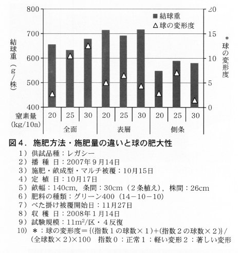 表層施肥法は,マルチ内の植え付け位置付近の表層に肥料が混和されるため,全面全層施肥や側条施肥に比べ,初期から肥効が現れ生育が旺盛となり,その後も肥効が安定する。施肥量は,慣行の全面全層施肥の窒素成分量30kg/10aに比べて20kg/10aに減量しても,結球重が大きく,球の変形度も全面全層施肥に比べて全体に小さく,球の形状も安定する(図4)。