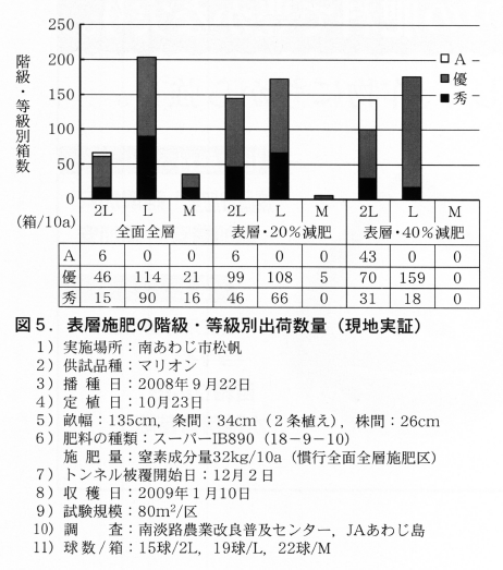 但し,表層施肥40%減肥では,現地試験の委託先生産者が,肥料不足を心配するあまり草勢をつけるためトンネルの裾を閉めて管理したことにより,球の形状が乱れA品が多くなった。