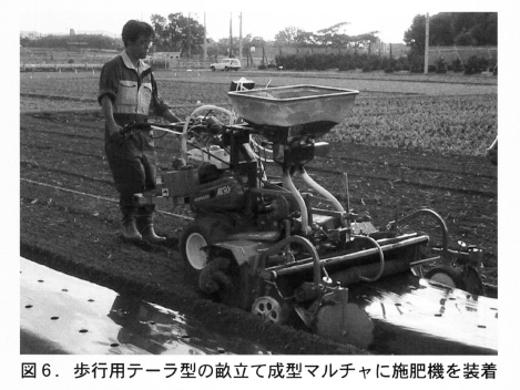 3)本技術を導入するには,既に所有のトラクタ型や歩行用テーラ型(図6)の畝立て成型マルチャに加えて,新たに装備する施肥機に15万円程度のコストを要する。