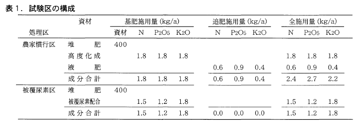 そこで,速効性の肥料に比べ作物に対する効率的な養分供給が可能な肥効調節型肥料(被覆尿素)に期待される全量基肥による労力の軽減,施肥窒素の利用率の向上による増収,及び環境負荷軽減を現地農家圃場で検証したので報告する。
