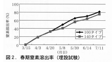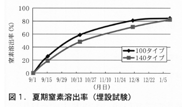 9月埋設は地温が最高30℃に達し,溶出が速やかであった(図1)。窒素80%の溶出に要した日数はLP100で90日,LP140で120日であった。