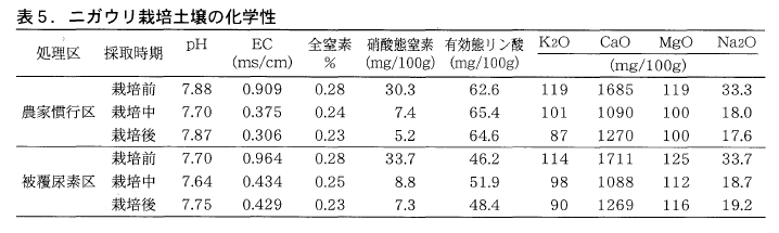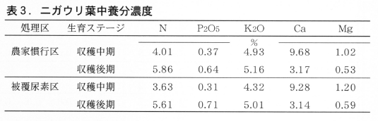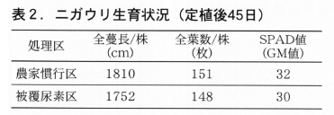 (5)Ⅲ区の結果からは窒素を全体で2割削減してもうね間慣行区と比較し生葉収量では同等,所得・経済性では若干上回り,この施用法は施肥基準がN40kg/10aに削減された現在,従来と同様な収量,品質に対応可能なひとつの技術であると考える。