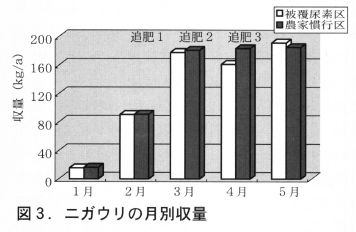 収量は両区とも600k/a以上で高水準にあった。被覆尿素区は初期生育が緩慢で初期収穫量の低下が懸念されたが慣行区との間に差はなく,2月の収穫量は約100kg/aであった(図3)。3~5月の収量は両区とも月当たり170kg/aあり,県目標の100kg/a/月を超えていた。