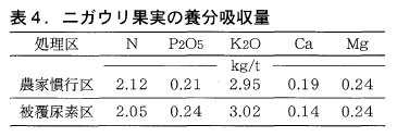 ニガウリ果実1t当たりの養分吸収量はカリが最も多く約3kgで,窒素吸収量より多くなった。次いでマグネシウム,リン酸,カルシウムで窒素吸収量の約10%程度であった。