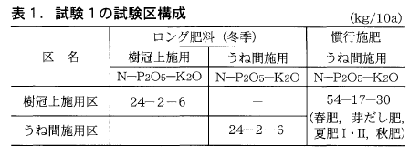 肥料の利用率向上と施肥量削減を目的にロング施用法として,試験1ロングの冬季樹冠上施用効果及び試験2冬季樹冠上施用とうね間施用を組み合わせた施肥法の効果を検討した。