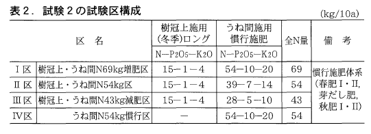 そこで,冬季の樹冠上からの被覆肥料の施用効果試験,さらに樹冠上施用とうね間施用の組み合わせ試験を実施,新芽の生育,品質への影響と施肥量削減を検討したので報告する。