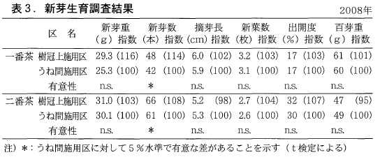 表3に試験2年目を迎える2008年の新芽の生育調査結果を示した。一,二番茶新芽ともに樹冠上施用区の新芽数がうね間施用区を有意に上回ったが,その他の項目では明確な差は見られなかった。外見的には樹冠上施用区の生育が良好に見えるが,新芽数の増加に伴い摘芽長,新葉数,出開度など他の項目では差は少なかった。
