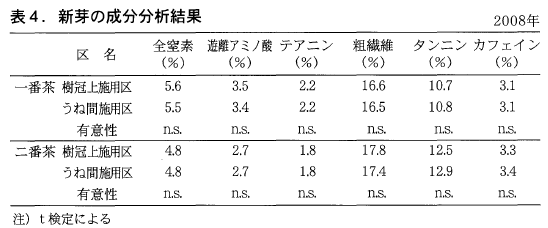 表4に2008年の一,二番茶新芽の成分分析結果を示した。ー,二番茶新芽ともに処理間で有意な差は認められなかった。