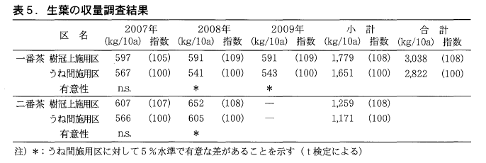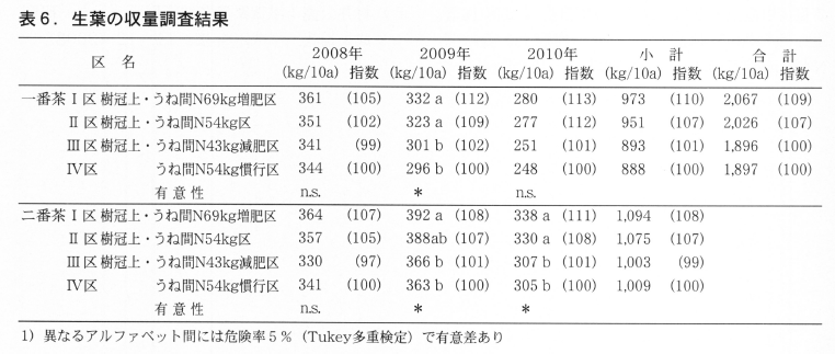 二番茶においては,2009年のⅠ区,2010年のⅠ区,Ⅱ区の生葉収量がⅢ区及びⅣ区よりも有意に多かった。二番茶における3年間の収量指数は,Ⅰ区108,Ⅱ区107,Ⅲ区99であった。ー,二番茶ともに生葉の収量は概ねN施用量が多いⅠ区が最も多く,次にⅡ区であり,施肥量が最も少ないⅢ区とうね間慣行区あるⅣ区はほぼ同等の収量であった。