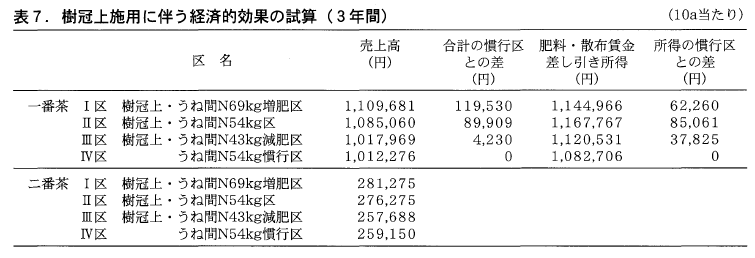 表7に樹冠上施用に伴う経済的効果の試算を示した。10a当りの一,二番茶の荒茶売上高合計は3年間で,うね間慣行であるN区(うね間N54kg慣行区)に比べ,N施用量が最も多いⅠ区(樹冠上・うね間N69kg増肥区)で119,530円増,Ⅱ区(樹冠上・うね間N54kg区)で89,909円増,Ⅲ区(樹冠上・うね間N43kg減肥区)4,230円増といずれの区も増加した。また,一,二番茶の売り上げの増加額は各処理区ともに一番茶で80%以上を占めていた。さらに肥料代・散布賃金を差し引いた所得でもN区に比べⅠ区62,260円増,Ⅱ区85,061円増,Ⅲ区37,825円といずれの区でも増加し処理区の中では,Ⅱ区の所得が最も高かった。Ⅲ区は,Ⅱ区,Ⅳ区より窒素が2割減肥区であるが,Ⅳ区よりも若干上回る所得,経済性が得られた。この区の施肥管理法は,施肥基準がN40kg/10aに削減された現在,従来と同様な収量,品質に対応可能なひとつの技術であると考える。