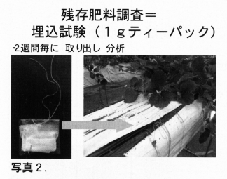 そこで平成18年に,当時県内で使われていた溶出日の異なる2銘柄の高設ベッド内での溶出を比較し,選定を行った。供試したのはエコロングトータル313の140タイプと180タイプで,試験品種は「章姫」,高設ベッドは培土量株当たり約2.5㍑で,発泡スチロール製槽で,排液非回収方式である。Nを14.3で揃え,土壌改良資材として苦土石灰55kg,ようりん32kg,ケイサンカリ32kg(全て10a当たり)を施用して,肥料中の窒素(硝酸態,アンモニア態)の残存率を肥料埋め込み試験(写真2)により調査した。(残存窒素測定は三重県農業研究所循環機能開発課)