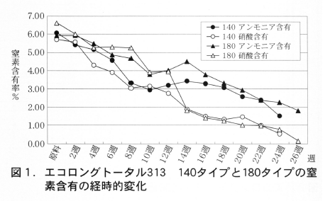 今回の調査では硝酸態窒素において特に4週~12週目にかけての溶出で140タイプが180タイプより明らかに早い溶出を示していた。しかし14週日以降では140タイプと