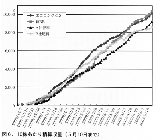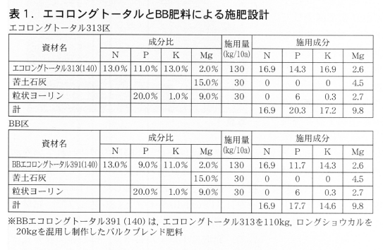 以上のことから収量は,初期収量はエコロングトータルが優れるが,最終収量ではロングショウカルを組み合わせた新BB区が優れていたことになる。