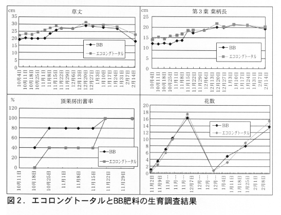 エコロングトータルの方が11/中旬まで明らかに樹ができており,草丈,葉長とも大きかった。花に関しては,頂花房の出蕾は新BB肥料の方がやや早いように見られたが,11/下では差が分からなくなった。花数に関しても頂花房,腋花房とも差は認められなかった(図2)。