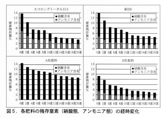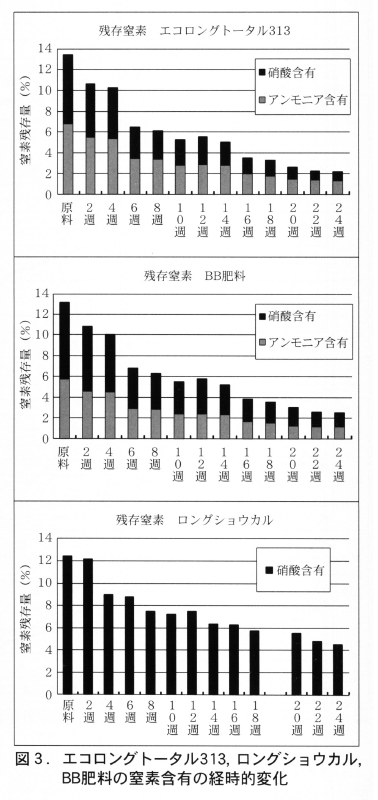 最も窒素肥料の溶出が早いのが慣行のロングトータル313区であった。6週目で50%,140日で80%の窒素が溶出していた。新BB区もこれに次いで窒素の溶出は早いが,アンモニアの溶出が早く,硝酸態窒素は慣行ロング区よりも溶出は遅かった。