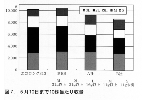 収穫開始は12/7からで,2月末までで収量が最も多かったのはエコロング区で5,458g/10株,次ぎにB社区で4,685g/10株,次ぎに新BB区で,239g/10株,A社区は3,972g/10株であった。大玉比率(2L以上)はA社区以外は約70%で,A社区は66%であった。更に3/12まででは,エコロング区6,551g/10株,新BB区5,790g,B社区5,686g,A社区4,739gとなった。2L以上の大玉比率は,新BB区が75%で次ぎにB社区71%,エコロング区69%,A社区67%であった。最終5/10まででは,収量が最も多くなったのは新BB区で10,363g/10株で次いでエコロング区10,203g/10株,A社区9,240g/10株, B社区8,604g/10株の順となった。(図6)