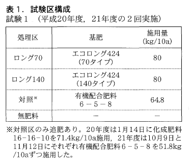 供試した肥料は慣行としてエコロングトータル313(140タイプ)と,エコロングトータル313(140タイプ)にロングショウカル(140タイプ)を85:15で配合し,アンモニア態窒素:硝酸態窒素の比率を5.5:7.3に自家バルクブレンドしたBB肥料で行った(表1)。