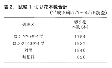 調査期間内の切り花本数の合計は,両年度とも140タイプで多くなった。切り花品質では,ロング施用区と対照区で大きな差は見られず,処理区ごとで,切り花の外観に見分けられるほどの違いはなかった。