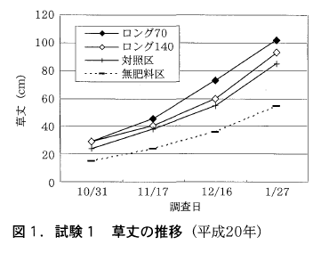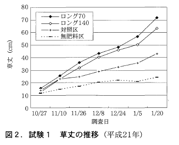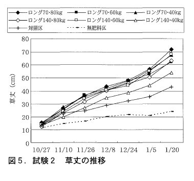 1月下旬までの草丈の推移を見ると,ロングを施用した区はいずれも対照区より高く推移した(図5)。