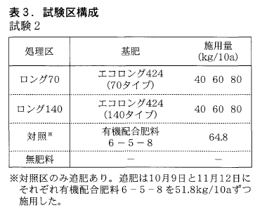 溶出日数70タイプと140タイプについて,それぞれ施用量を10aあたり40kg,60kg,80kgに設定して試験を行った。対照区と無肥料区は試験1と同様に設定した。
