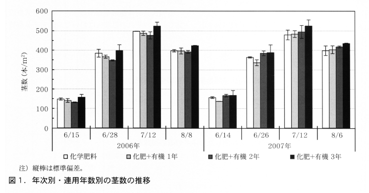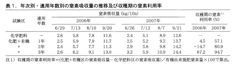 2006年の場合,化肥+有機区の連用1年目,2年目の茎数は化学肥料区と同等か少なく,窒素吸収量も化学肥料区なみの推移を示したが,連用3年目では茎数・窒素吸収量とも化学肥料区より多く推移した。2007年の場合,連用1年目では6/26まで茎数が化学肥料区より少なかったが,その後同等となり,連用2年目,3年目では生育期間を通じて化学肥料区より茎数が多かった。窒素吸収量は,生育期間を通じて連用年数の長い方が多く,窒素利用率も高かった(図1,表1)。