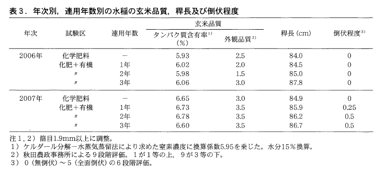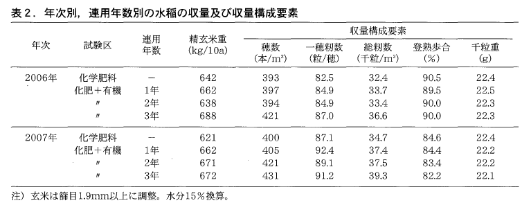 精玄米重は,2006年には連用2年目が化学肥料区なみであったが,1年目,3年目は化学肥料区を上回った。2007年は連用年数によらず化学肥料区を40~50kg/10a上回った。穂数は2カ年とも連用3年目が最も多かった。玄米品質では,タンパク質含有率には両年とも有機質資材施用の影響が認められないが,外観品質は2007年において連用年数によらず悪化した。また,連用により稈長は増加する傾向にあり,2007年には倒伏程度が若干高まった(表2,表3)。