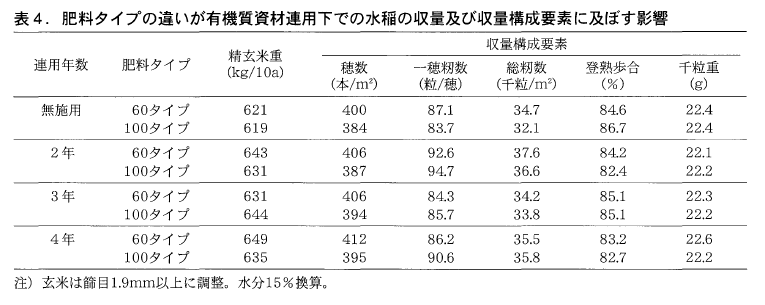 有機質資材をシグモイド型被覆尿素60タイプ(苗箱まかせN400-60)と組み合わせた場合,連用3年目には茎数が取れやすくなり窒素吸収量も増えて増収する一方,稈長が増加した。また,出穂期以降が高温・少照気味であった2007年は,有機質資材の施用により倒伏程度が高まり外観品質も悪化した。一方,100タイプを用いると,穂数はやや少ないものの60タイプとほぼ同等の収量が得られ,有機質資材連用下でも倒伏しにくく外観品質も悪化しないことから,有機質資材と組み合わせる肥料タイプとして適切であると考えられた。