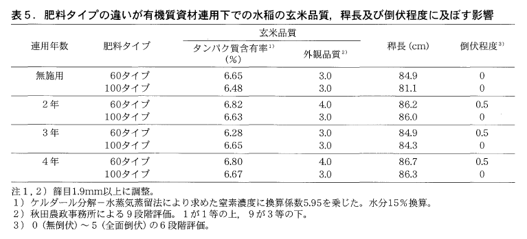 連用年数にかかわらず穂数は60タイプの方が多いものの,連用年数に応じて総籾数の差は小さくなり,精玄米重にも肥料タイプによる明瞭な違いが認められなかった。稈長は,有機質資材無施用の場合を除いて肥料タイプ間の差は小さかったが,外観品質と倒伏程度は100タイプが優る傾向にあった(表4,表5)。