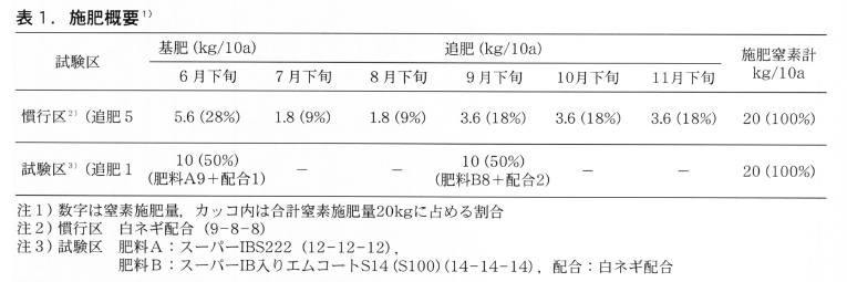 試験では水田栽培という土壌条件と作付け時期を考慮して,表1に示した2種類のIB肥料を使いましたが,畑地で栽培する場合や作付け時期が異なる場合には,肥料タイプや施用時期等について別途,肥料メーカ一等に相談したほうが良いでしょう。