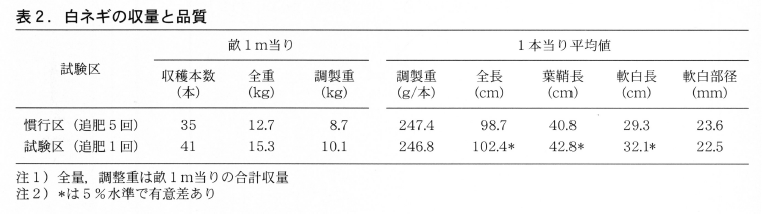 試験栽培終了後の収量調査結果を表2に示しました。このように基肥+追肥1回だけで慣行区と同等以上の収量が得られました。