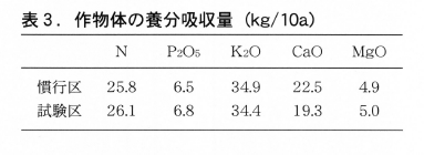 収穫時のネギの養分吸収量は表3に示したように,慣行施肥栽培とほぼ同じでした。