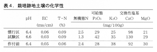 栽培跡地土壌に残った養分量を表4に示しました。IB肥料を使った試験区では,可給態リン酸(P2O5),交換性の石灰(CaO),苦土(MgO),カリ(K2O)が慣行施肥区よりもやや多い傾向でした。