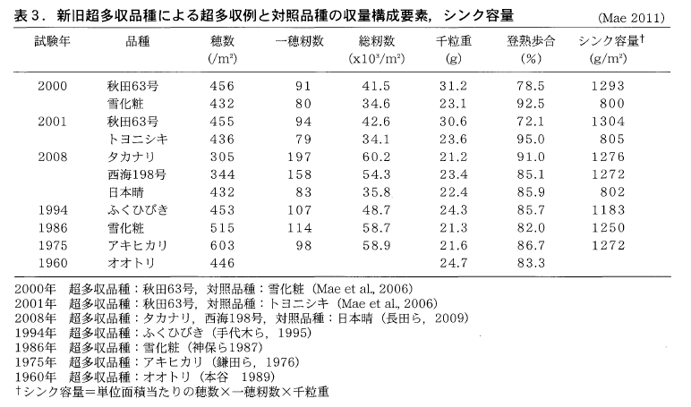 表3には1975年以降に超多収を達成した例における収量構成要素,シンク容量,登熟歩合が2000年-2003年の対照品種を含めて示してある(表2と同じ試験)。超多収を示した秋田63号,タカナリ,西海198号,ふくひびき,アキヒカリ,1986年の雪化粧のシンク容量は1183-1304g/㎡の範囲にあったが,対照三品種のシンク容量はいずれも800g/㎡程度と超多収品種より30-40%少なく超多収レベルのシンク容量を確保出来ていなかった。登熟歩合は85.1-92.5%であった。