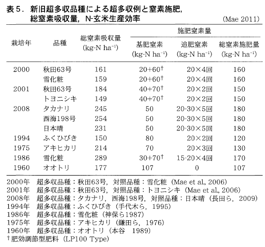 表5に超多収例における窒素施肥について示した。超多収を実現するためにはイネに多大の窒素を適期に適量ずつ吸収させなければならない。もっとも重要で工夫の要る点である。秋田63号の場合は合計で150-160kg-N/haの窒素施肥が行われている。基肥は速効性窒素肥料を20-40kg-N/aと肥効調節型窒素肥料(LP-100Type)60-70 kg-N/haを施肥している。追肥は速効性肥料一回当たり20kg-N/haとして稲作期間中に2-4回施している。このような施肥設計は,超多収イネの一生を通しての窒素吸収パターンを念頭に置いて行われている。1986年の雪化粧の施肥は,施肥量が若干多いことを除いて秋田63号の場合と似通っている。タカナリ,西海198号では180kg-N/haとさらに多い量施している。基肥として50kg-N/ha,追肥として一回当たり20-30kg-N/haを稲作期間中に5回施している。一方,ふくひびき,アキヒカリ,オオトリの総窒素施肥量は上記の場合に比べ107-130kg-N/haとかなり少ない。そして基肥量が70-107kg-N/haと多い傾向にある。とくに「米作日本一表彰事業」で1位となった1960年のオオトリの場合の施肥は,基肥に107kg-N/ha与えただけで追肥は行っていない。基肥施肥量や追肥量は,品種特性に加えて,作土の厚さ,耕起の深さ,土壌肥沃度と稲作期間中における窒素発現パターン,土壌の物理化学的性質,使用する肥料のタイプ(速効性,緩効性),施肥法(表層,全層,深層),稲作期間中の栽培管理法,気象の地域特性等を考慮して決められなければならない。超多収イネの窒素要求量は成育段階により変化していく。土壌から供給される窒素と肥料から供給される窒素がイネの一生を通して要求量に見合って供給されるように施肥設計し,栽培管理していくことが超多収にとっての鍵となる。