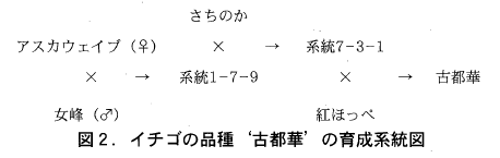 図2は育成系統図である。交配は2002年に行い,播種して得られた600株の実生個体の中から,2002年9月から2003年3月の促成栽培において1個体を選抜した。2003年から2005年の促成栽培において生食用イチゴとしての実用形質を調査し,2005年より特性検定と生産力検定,2006年より現地適応性検定を行った。各検定の結果から実用に適う品種であると判断して,’古都華7と命名し,2009年7月16日に品種登録出願を行い,2011年10月5日に品種登録された。
