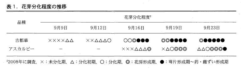 奈良県における無仮植育苗での花芽分化期は9月15日前後である(表1)。