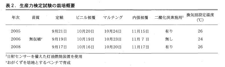 2005年,2006年および2008年に表2に示した栽培概要により促成栽培を行い,生産力を検定した。’古都華’の収穫開始日は11月下旬から12月初旬で’アスカルビー’とほぼ同じか僅かに早く,’章姫’よりやや遅い。
