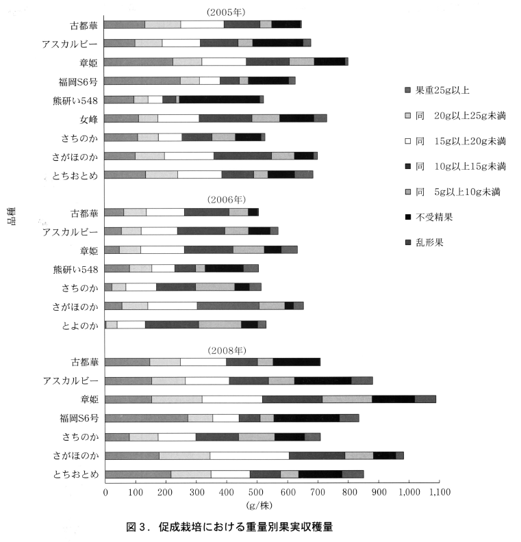 不受精果率には年次変動がみられるが,乱形果の発生は極めて少なく正常果率は‘アスカルビー’よりも明らかに大きくて‘章姫’と同程度以上である。15g以上の正常果の収穫果重は,‘アスカルビー’と同等以上である(図3)。