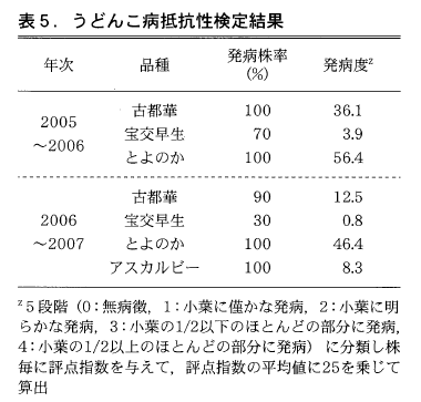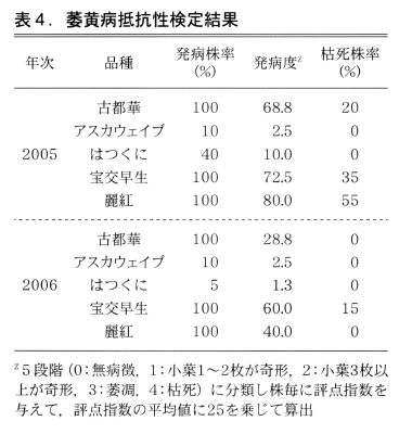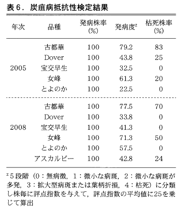 自然発生による検定試験を3ヶ年実施した結果,罹病性品種の’とよのか’より発病度はやや小さい傾向が認められたものの,発病株率は同程度であったことから,罹病性と判断される(表5)。