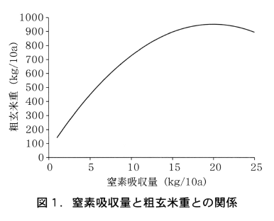 「べこあおば」の窒素吸収量と粗玄米重との関係を図1に示す。窒素吸収量20kgN/10a程度で粗玄米としての最大収量約950kg/10aとなる。
