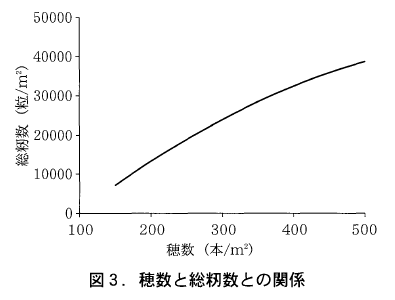 図3に示す籾数と穂数との関係を見てみると,粗玄米重950kg/10aに必要な総籾数34千粒を得るための穂数は420~430本/㎡となり,粗玄米重900kg/10a,総籾数31千粒には380~390本/㎡の穂数が必要である。