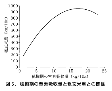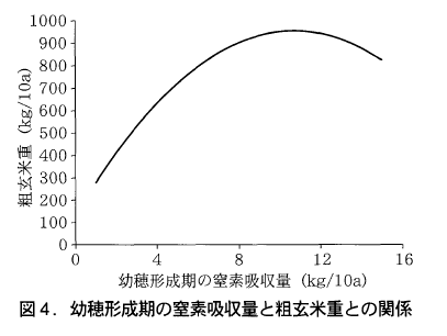 次に時期別の窒素吸収量と収量との関係を図4と図5に示す。時期別間の相互関係は無視し,単純に収量との関係で見れば,粗玄米重950kg/10aとなる幼穂形成期の窒素吸収量は10kgN/10a,穂揃期は16Nkg/10a程度となる。粗玄米重900kg/10aでは幼穂形成期の窒素吸収量は8kgN/10a,穂揃期は13kgN/10a程度となる。