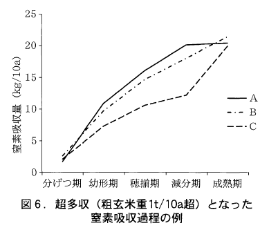 1t/10aを超える収量となった処理区の窒素吸収過程の例を図6に示す。A,Bは概ね上記950kg/10aとなる時期別窒素吸収と同様であったが,Cでは大きく異なっていた。Cの場合,減数分裂期後の窒素吸収が全生育期間の4割程度も占め,登熟期間の気象が好条件であることが前提とは思われるが,生育後半の窒素吸収が多収に貢献し得ることが示されている。よく見るとA,Bについても全窒素吸収量に占める各時期の窒素吸収割合は一様ではなく,「超」のつくような多収レベルにも関わらず,それほど厳格な窒素吸収パターンが求められるわけではないようである。