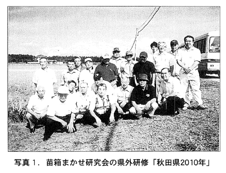 ①生産者から雫石町に合致した使い方を普及させたいと苗箱まかせ研究会が立ち上り,早坂忠孝さんが会長に選ばれ活動を始めました。