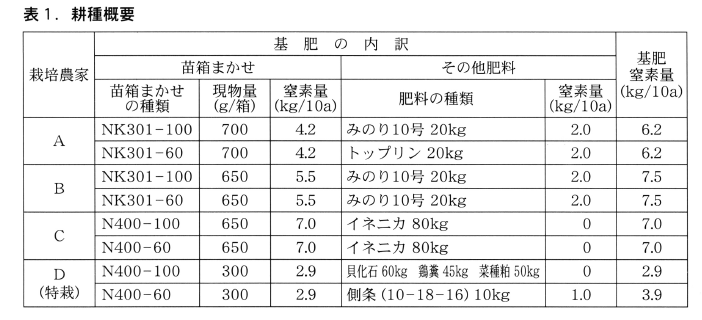 調査対象農家は,食味値の観点から100タイプと60タイプの比較を農家4戸に依頼し実施しました。苗箱まかせの施肥量は,一般栽培では,4.2~7.0kg/10a,特別栽培では2.9kg/10aでした(表1)。調査項目は,いろいろな施肥体系があることから耕種概要調査に加えて生育調査,収量調査および食味値調査(サタケ食味計による「食味値」「蛋白質」の分析)を行いました。